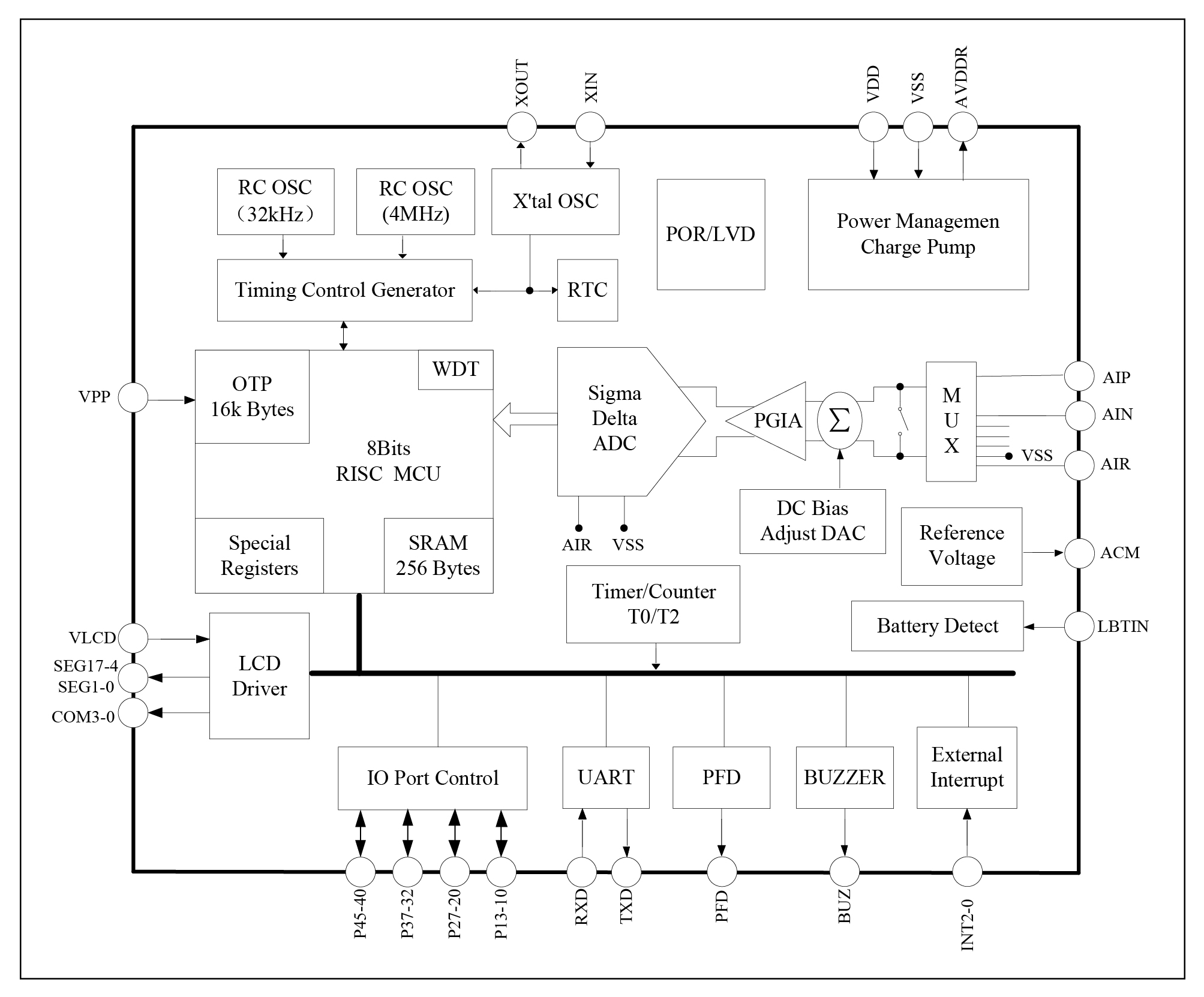 8 bits RISC ultra low power MCU, 49 instructions and 6 stack levels. The MCU current consumption is 600uA typically at 3V and 2MHz operating clock rate, 1.8uA at standby and 32kHz clock, and less than 1uA at sleep