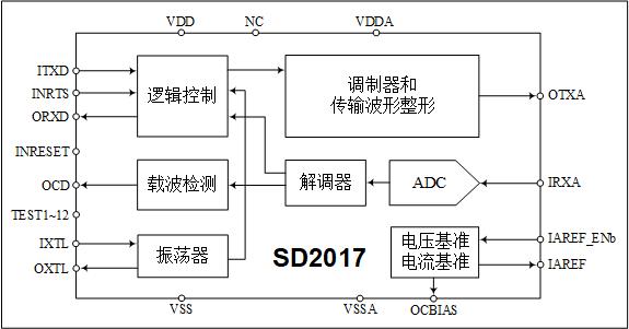 SD2017是一款专为实现HART协议而设计的CMOS单片调制解调器芯片,用于支持HART协议的现场仪表和控制器中。芯片只需外加少量无源元件,即可满足HART物理层规范功能要求,包括调制与解调,输入信号滤波,载波检测和发送信号波形整形等。
