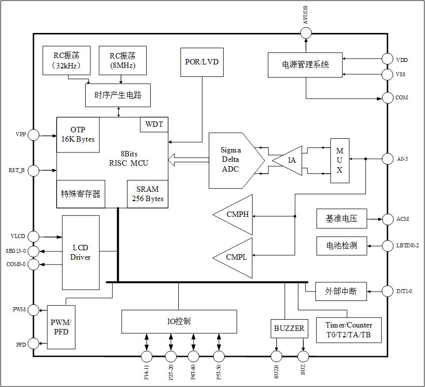 8位RISC超低功耗MCU,49条指令,6级堆栈,在2MHz工作时钟,MCU部分在3.3V工作电压 下电流典型值为400μA;32kHz时钟待机模式下工作电流1.5μA,休眠模式电流小于1μA
