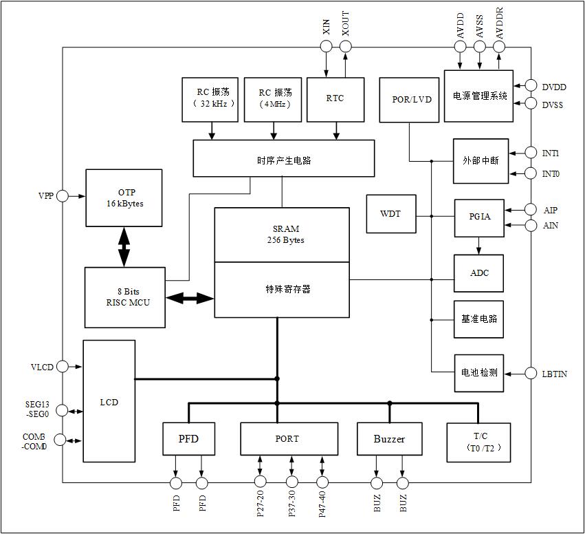 8位RISC超低功耗MCU,49条指令,6级堆栈,在2MHz工作时钟,3V工作电压下 电流典型值为300μA;32kHz时钟待机模式下工作电流1.5μA,休眠模式电流典型 值为1μA