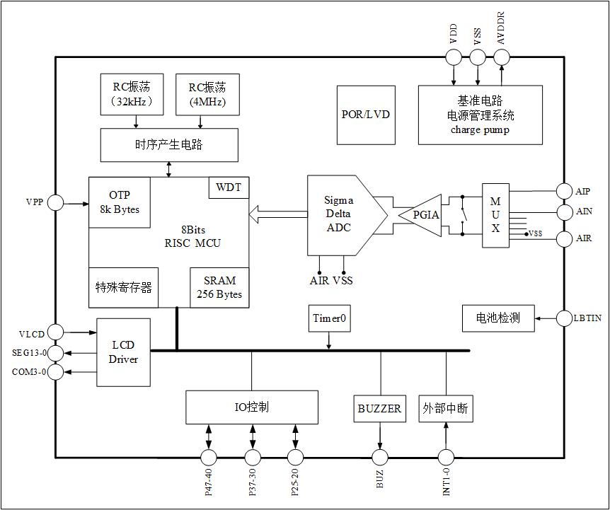 8位RISC超低功耗MCU,49条指令,6级堆栈,在2MHz工作时钟,MCU部分在3V 工作电压下电流典型值为500μA; 32kHz时钟待机模式下工作电流1.5μA,休眠模 式电流典型值为1μA