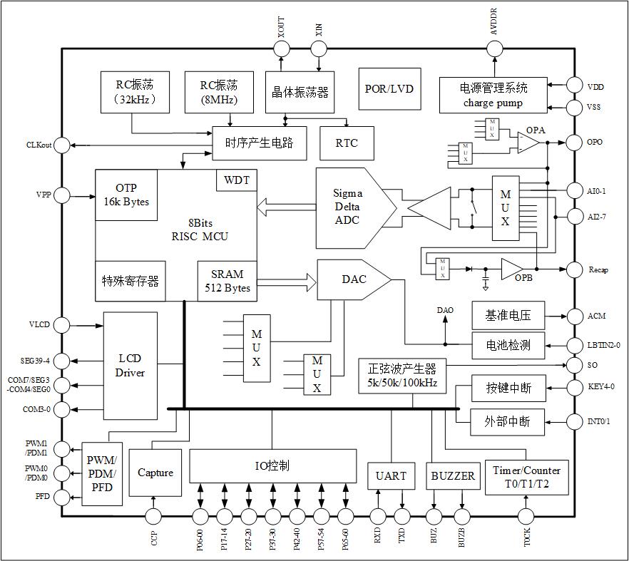 本芯片是带24位ADC的SoC产品,程序存储器为16k Bytes OTP,超低功耗设计,使用内部4MHz RC振荡器经内部电路处理而产生的2MHz时钟工作,3V工作电压下,典型应用时的工作电流只有1.5mA。