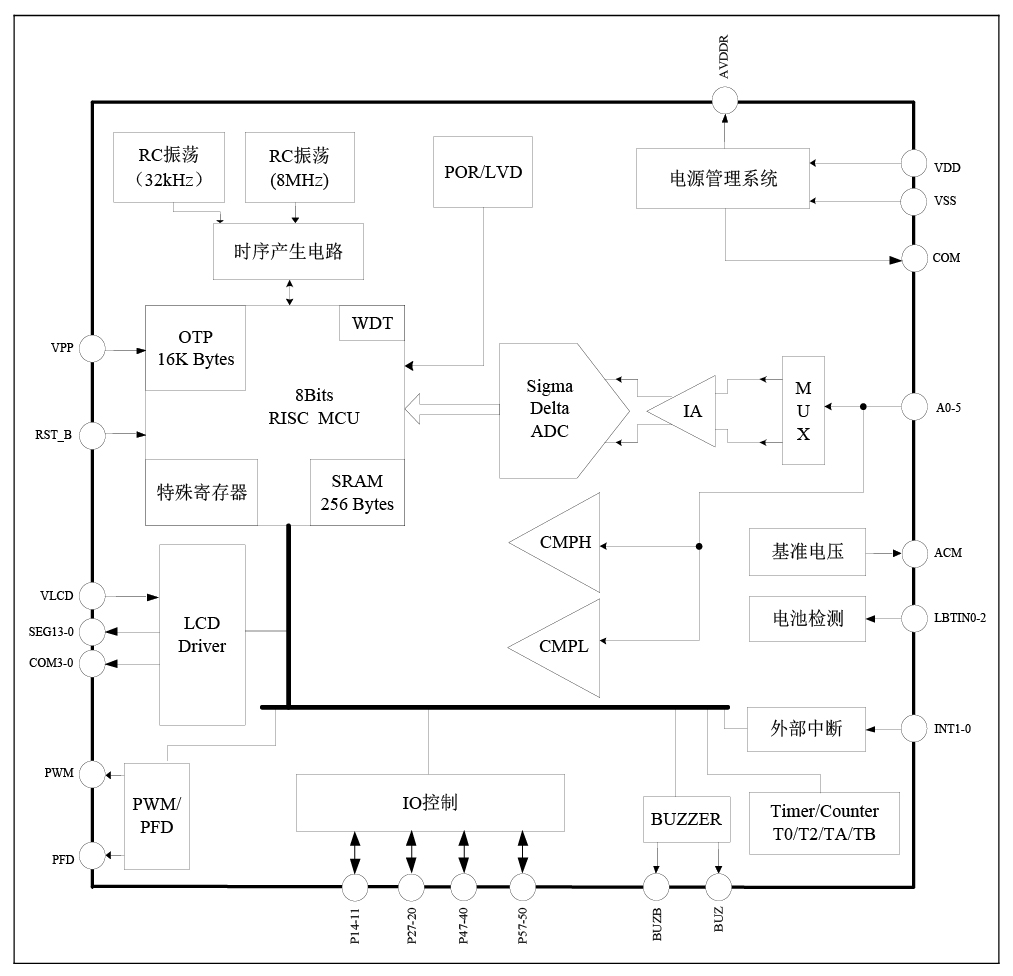 8 位 RISC 超低功耗 MCU, 49 条指令, 6 级堆栈,在 2MHz 工作时钟, MCU 部 分在 3.3V 工作电压下电流典型值为 400μA; 32kHz 时钟待机模式下工作电流 1.5μA, 休眠模式电流小于 1μA
