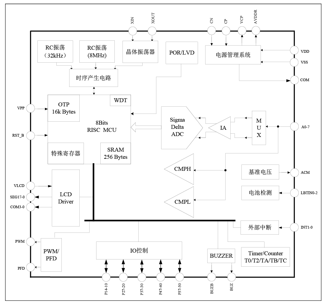 外围资源丰富:可选的多种稳压电源输出,灵活设置的 ADC 模块,升压模块, UART,带有CAPTURE功能的TIMER, PWM和PFD输出模块,LCD 驱动等。