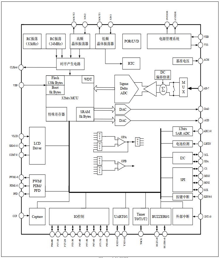 本芯片是带有LCD驱动和24位高精度ADC的32位MCU的SOC产品,提供120KB Flash空间用于存储用户程序。